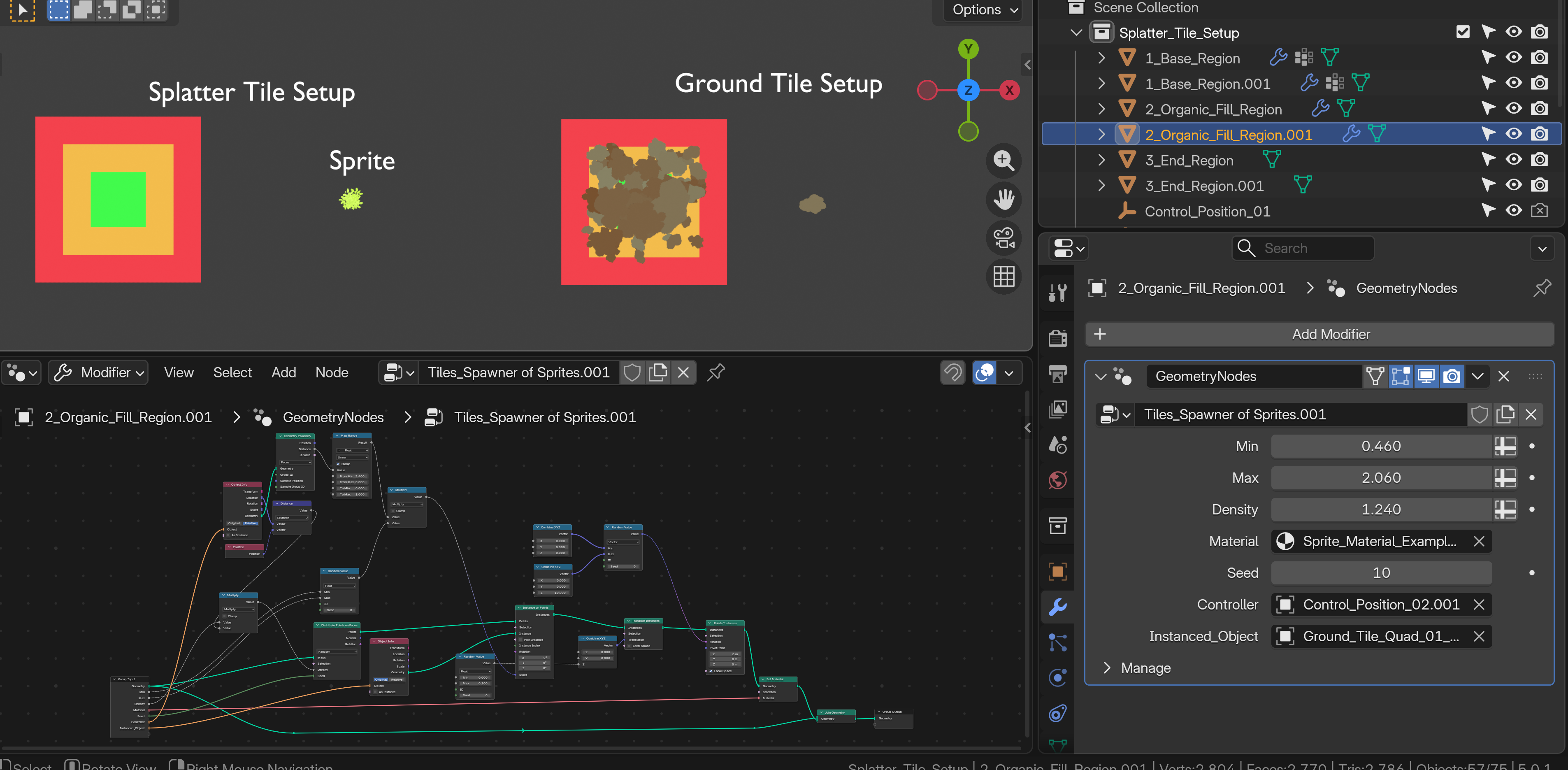 (Blender Geo nodes setup for instancing sprites over splatter-tile areas to create variations)