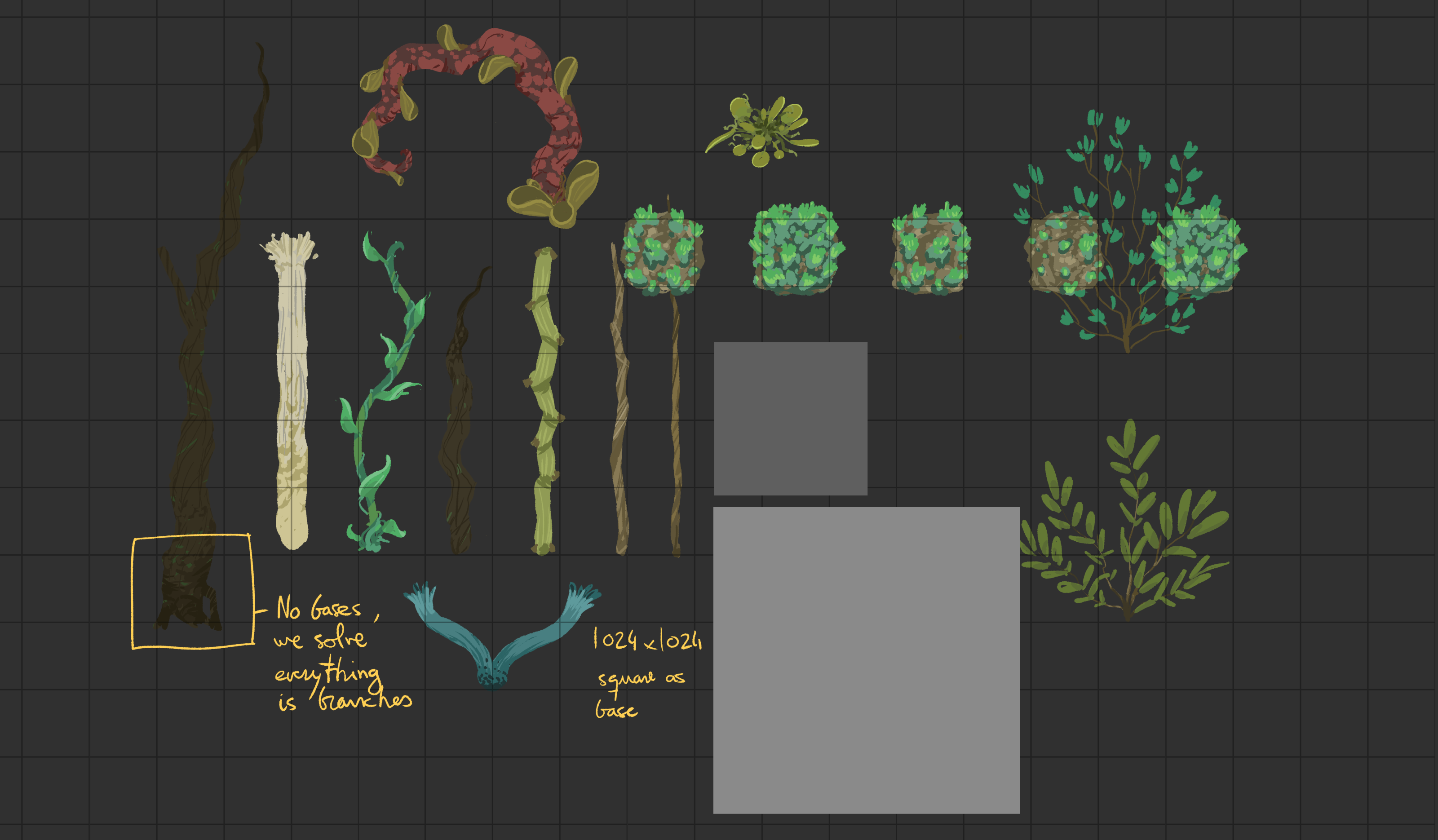 Everything for this game needed to be simpler, because the system was going to be a lot more complicated than with our previous attempt. I am not particularly happy with how things look, but soon after we began I realized that making varied plant modules that players would stitch together would look weird and alien. So I tried to go with the flow and make things weird and alien (kept looking at Scavengers Reigns)